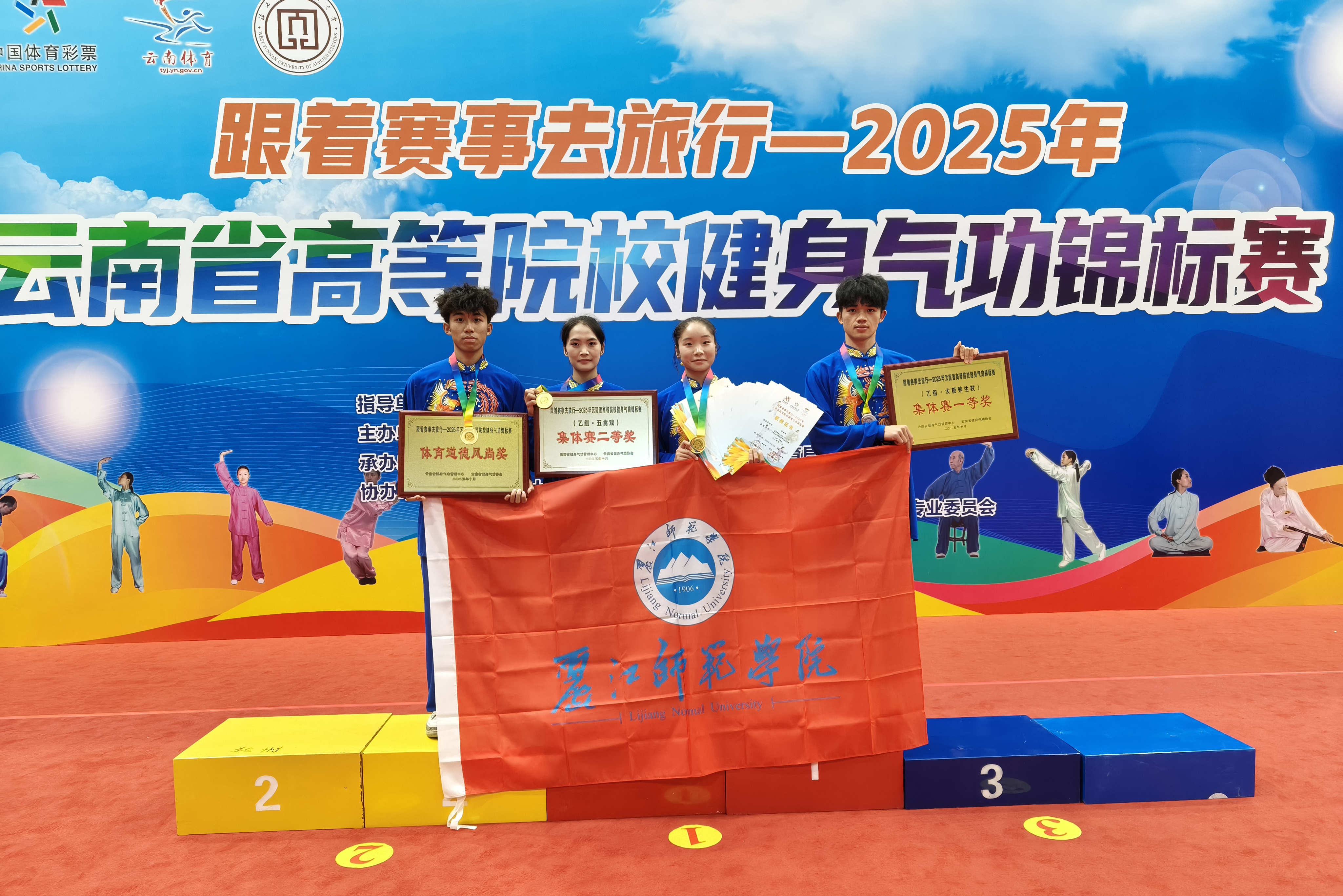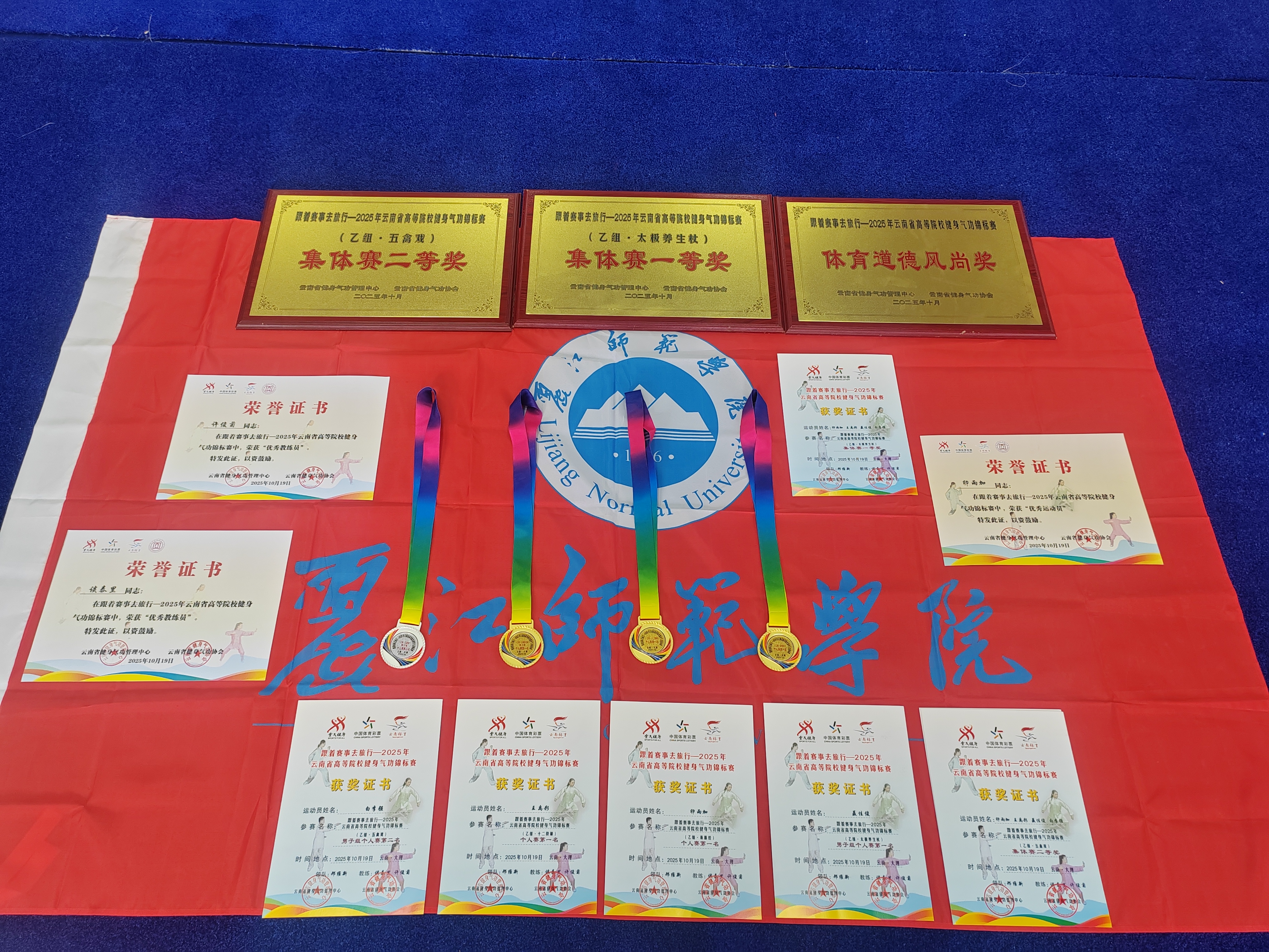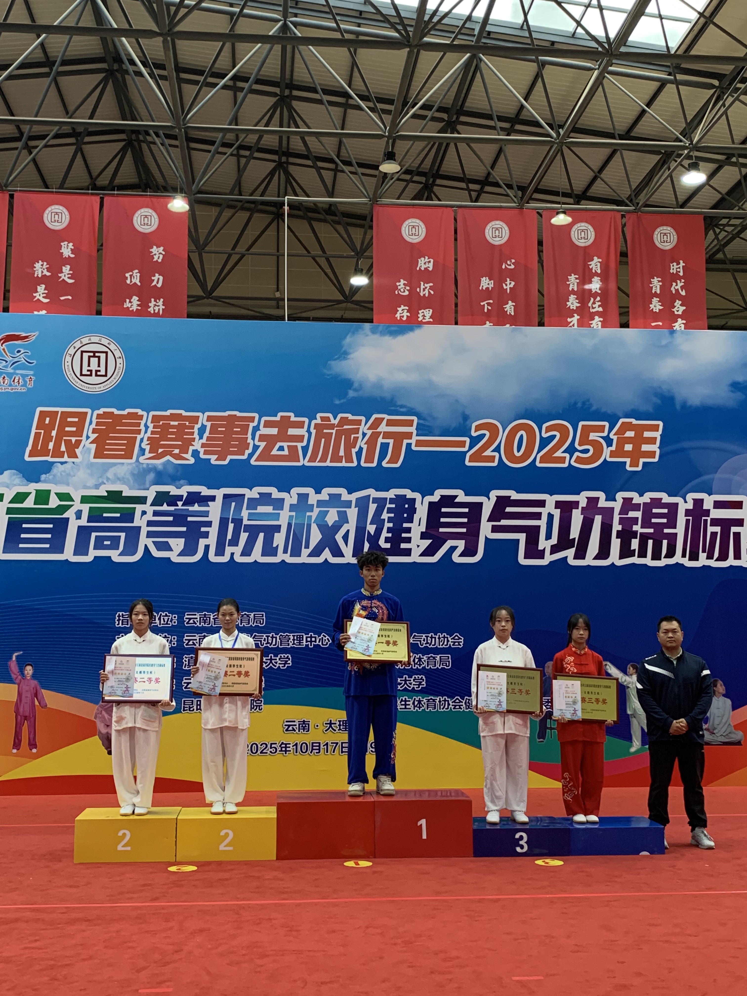 比赛中,选手们以流畅动作与沉稳气韵,在易筋经、八段锦、五禽戏、太极养生杖、十二段锦等主推功法项目中展开激烈角逐,将“形神合一”的功法精髓展现得淋漓尽致。丽江师范学院代表队凭借扎实功底与默契配合,斩获多项大奖:聂佳俊获乙组太极养生杖个人赛冠军,卯雨加获乙组易筋经冠军,王禹彩获乙组十二段锦冠军,白李强获乙组五禽戏亚军,同时摘得乙组太极养生杖集体赛一等奖、乙组五禽戏集体赛二等奖,并荣获“体育道德风尚奖”,带队教练获评“优秀教练员”。