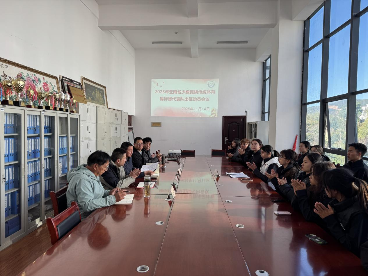 11月14日上午,代表丽江市参加2025年云南省少数民族传统体育锦标赛的我院高脚竞速队与民族健身操队赛前动员大会在体育馆二楼会议室举行。体育与健康学院党总支书记刘杰、副院长(主持工作)邢维新、副书记葛锦润、副院长和文华、副院长和执军参加会议,为即将出征的队员们鼓舞士气、凝聚力量。高脚竞速队与民族健身操队的全体教练员和队员共同参会,凝聚起备战赛事的昂扬斗志。
