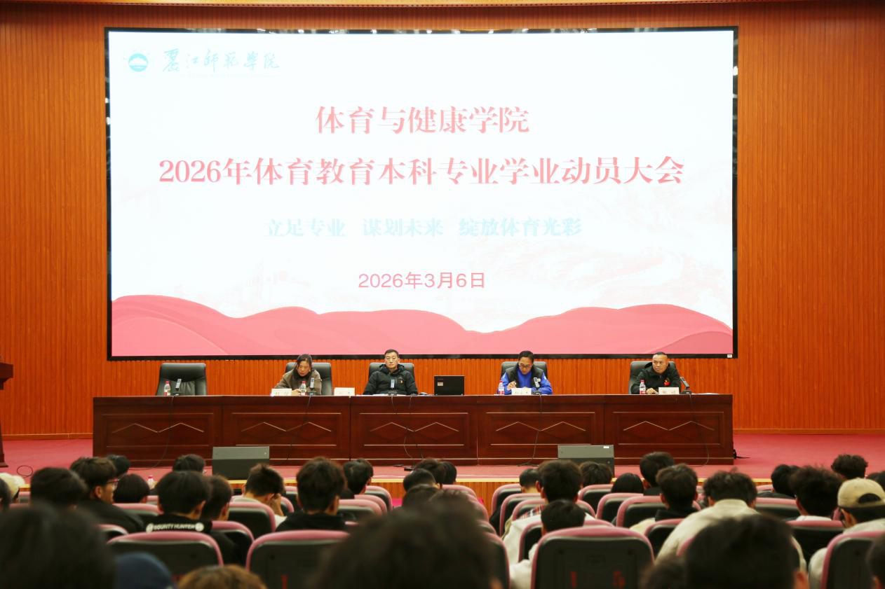 2026年3月6日,体育与健康学院在学校图书馆报告厅举行本科专业学业动员会。学院党总支书记刘杰、负责工作的副院长和永杰、体育教育本科专业负责人刘信、体育教育本科专业教研室主任张禄及全体体育教育专业本科生参加会议。