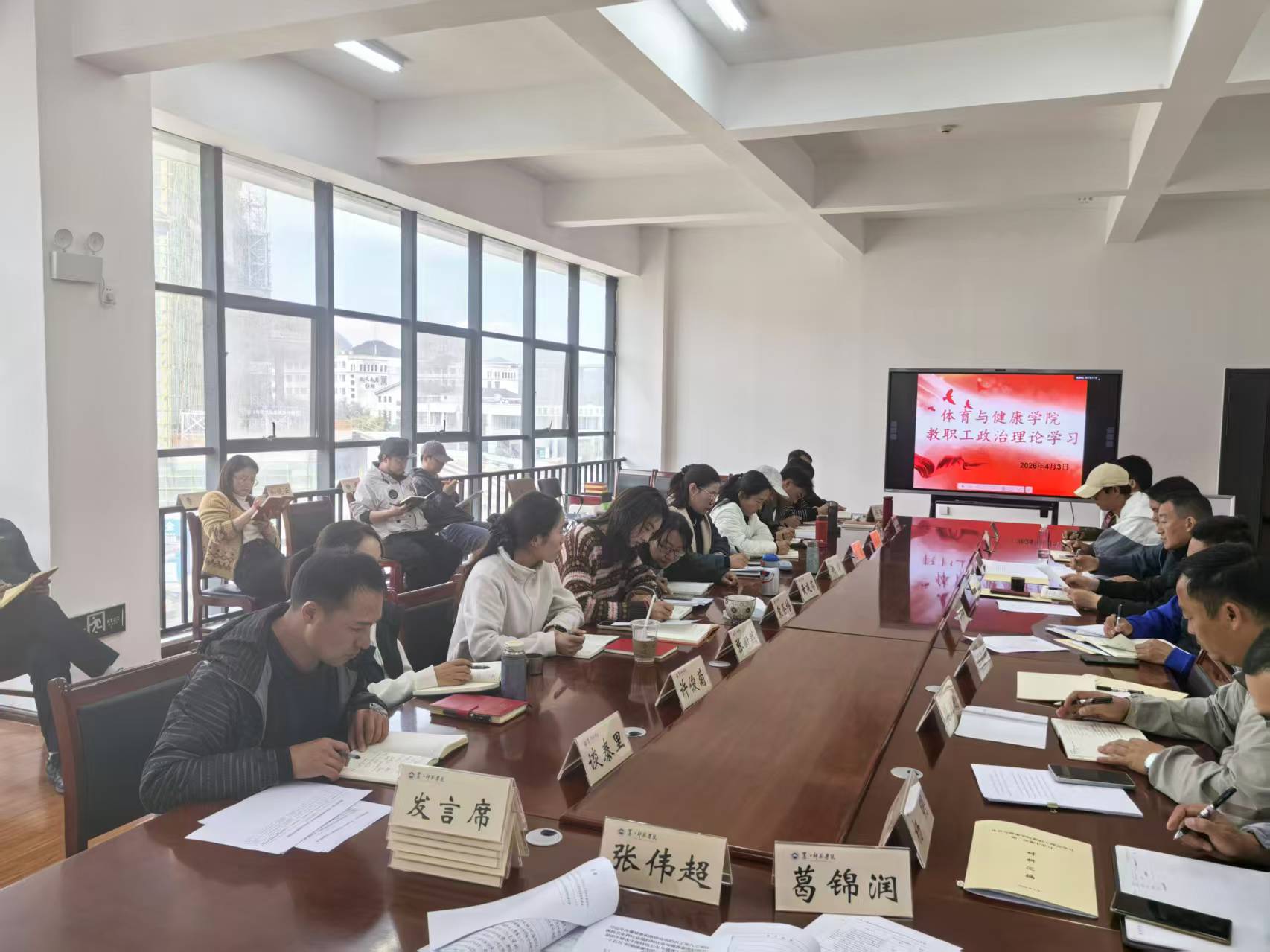 为持续加强教职工思想政治建设,夯实理论基础,凝聚发展共识,2026年4月3日14:30,体育与健康学院在体育馆三楼会议室组织开展第二次教职工政治理论学习。全院教职工全员参会,会议由刘杰主持。